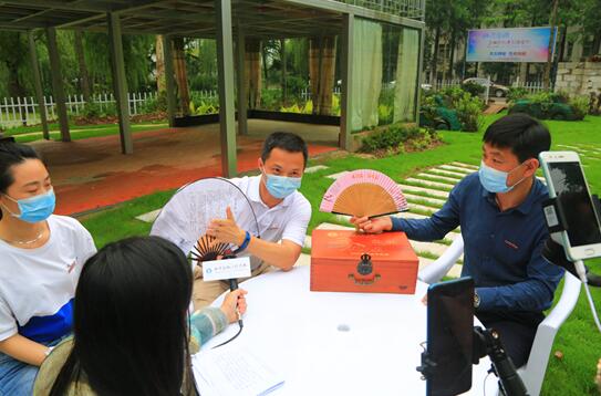 图为党委学工部常务副部长王龙(中)为网友们介绍2020届毕业生纪念品“三大件”的文化内涵