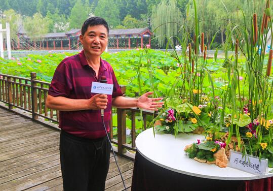 图为全国知名菊艺专家、插花艺术大师、该校“工匠教授”辛高炉向网友介绍“问天湖有我的爱”花艺作品